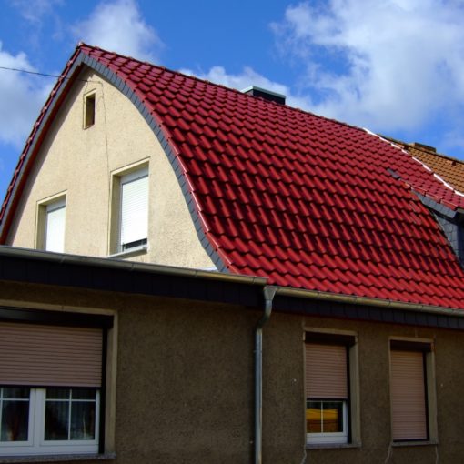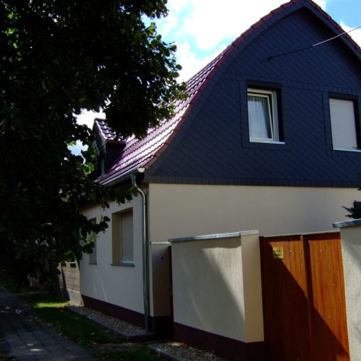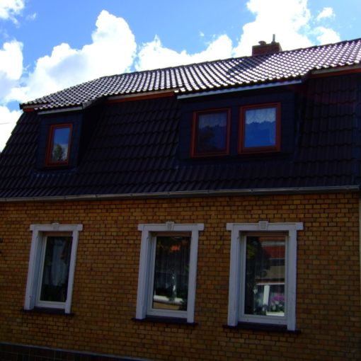 Greppin Dachsanierung durch Dachziegeleindeckung in Greppin Dachsanierung durch Dachziegeleindeckung mit Braas Betondachpfannen sowie Verschieferung des Giebels.